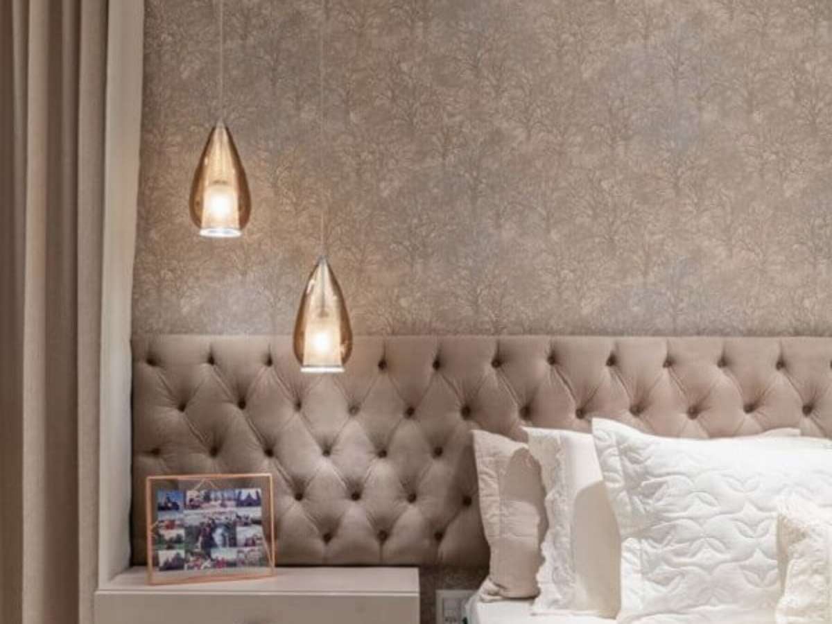 Os móveis e elementos decorativos também devem se harmonizar ao modelo do papel de parede para quarto, por isso, preste atenção nas cores, acabamentos e formatos de itens como poltronas, abajur, tapetes, cortinas entre outros.