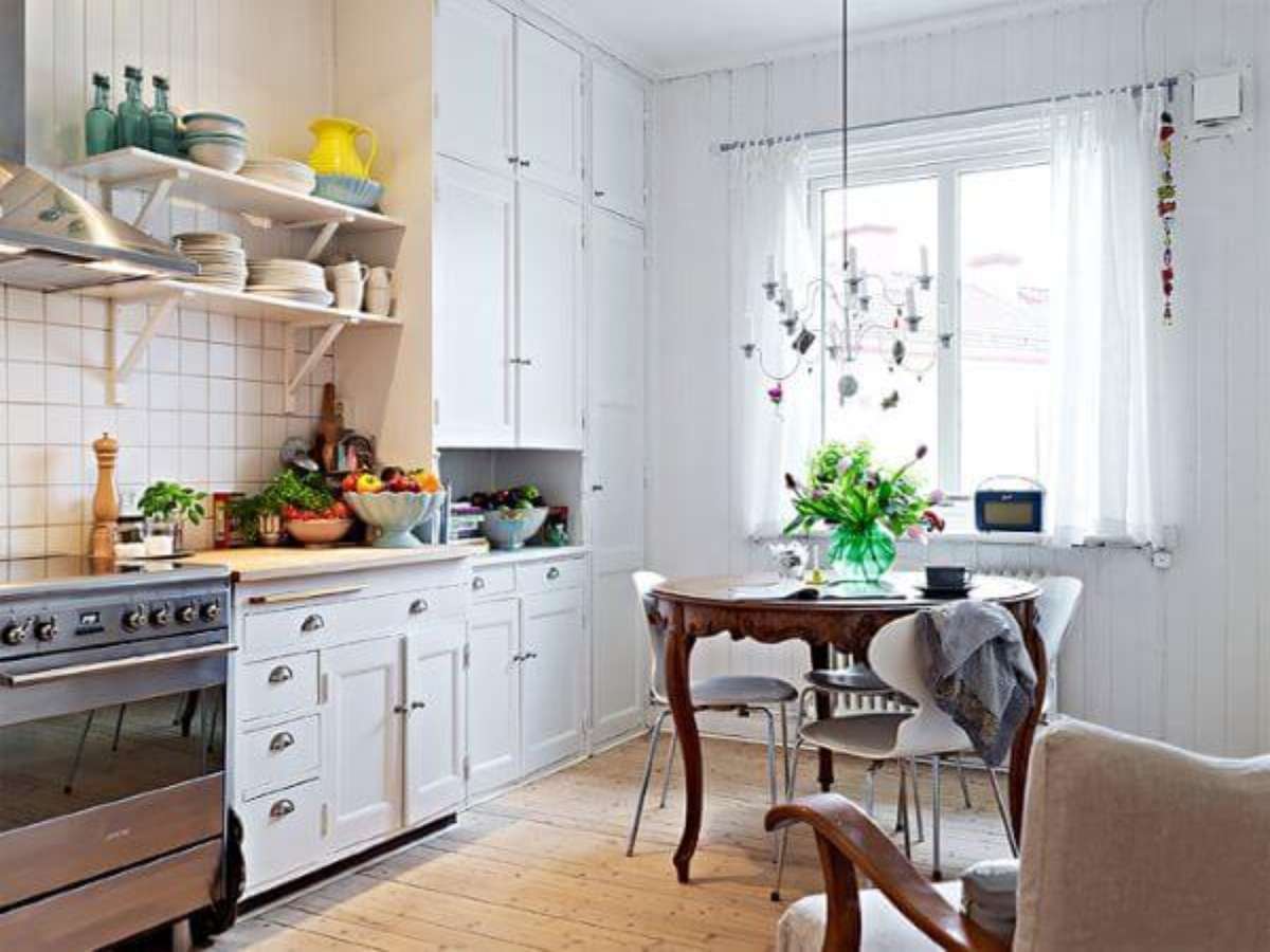 Cozinha escandinava pequena: Use armários e prateleiras para ganhar espaço