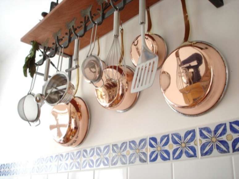 Os armários de cozinha podem ser enfeitados com uma coleção de canecas coloridas penduradas, mas cuidado para não exagerar no excesso de informações para não quebrar a harmonia do ambiente.
