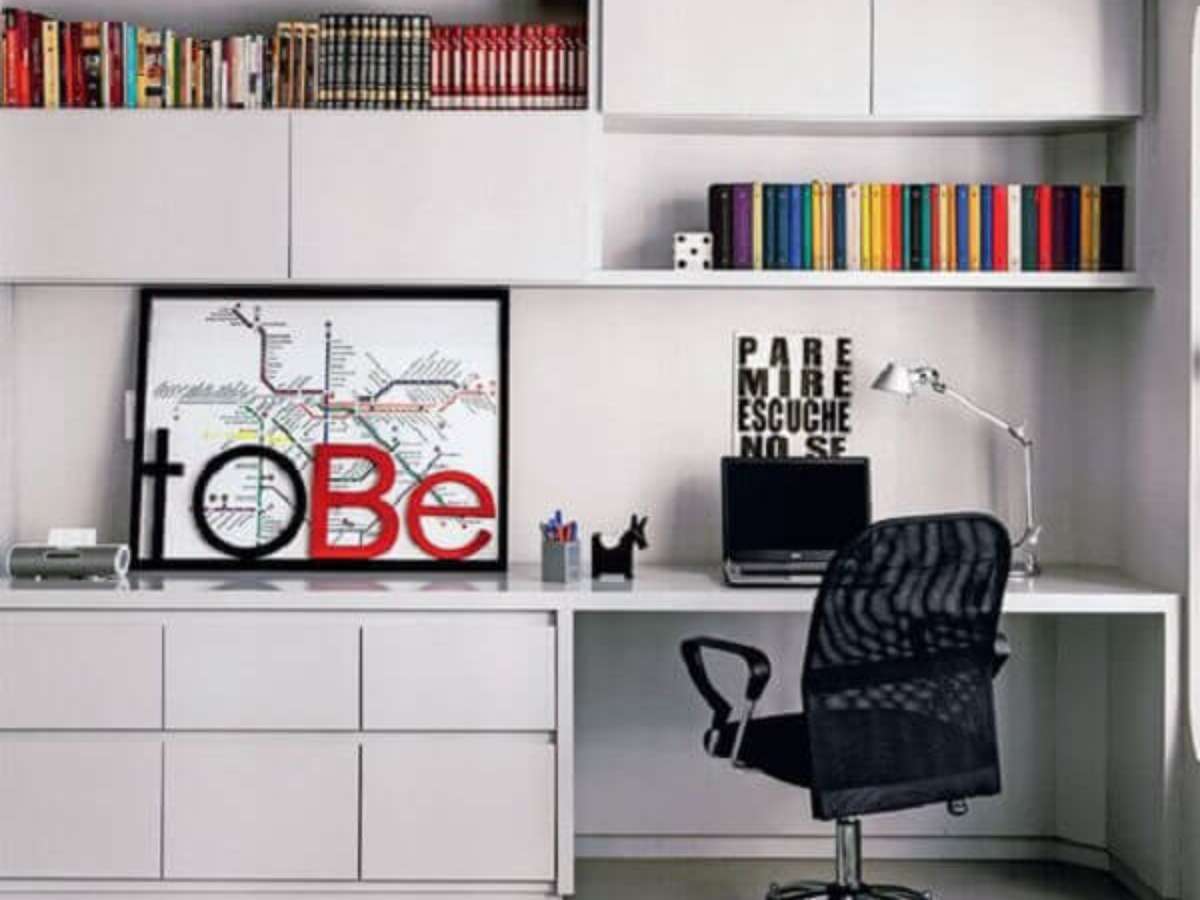 - Otimização dos espaços: os móveis como mesa e armários são construídos sob medida para o ambiente, preenchendo todos os espaços possíveis do cômodo;