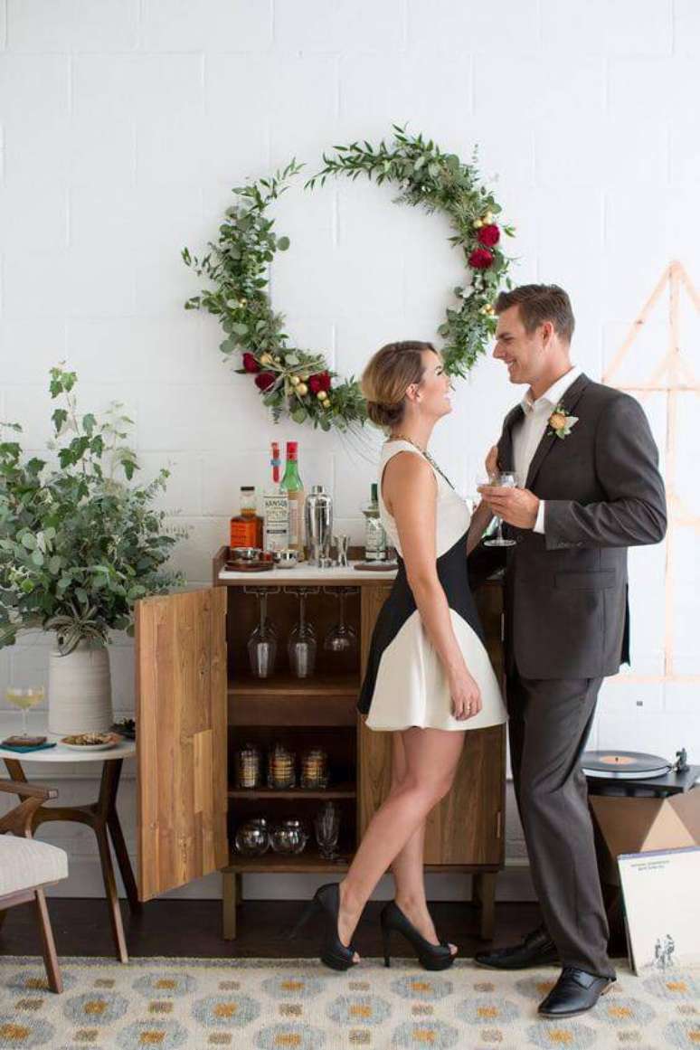 Use os elementos da sua casa ao seu favor: o lustre acima da mesa de jantar, o bolo decorado com muitas flores e folhagens…. Não se preocupe se você não tiver como investir em muitos enfeites, o simples também encanta na festa de casamento em casa.
