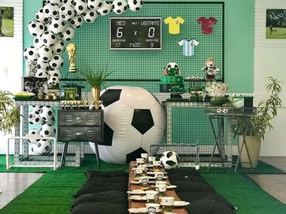 Troféus, bolas, camisetas de futebol, bexigas personalizadas, bandeirinhas, letras decorativas (com a inicial do aniversariante ou escrito "Goool"), tapete de grama sintética no chão e painel de fundo feito com cortinas de tecido, jardim vertical artificial ou pallet são muito bem-vindos.