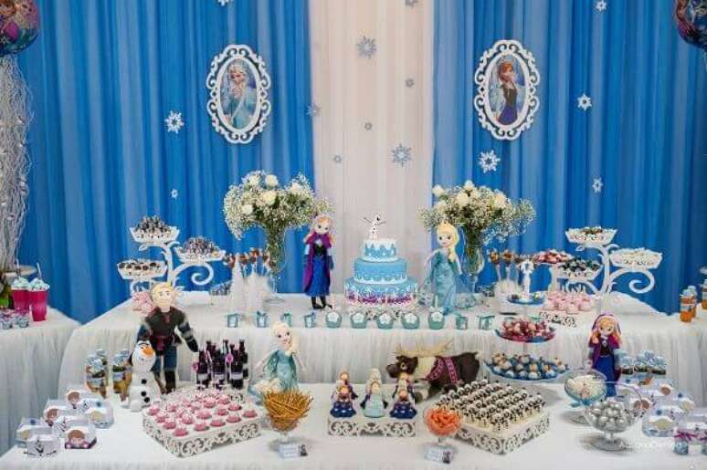 57- Na festa frozen ideias criativas a mesa foi forrada com tecido azul brilhante. Fonte: Pinterest