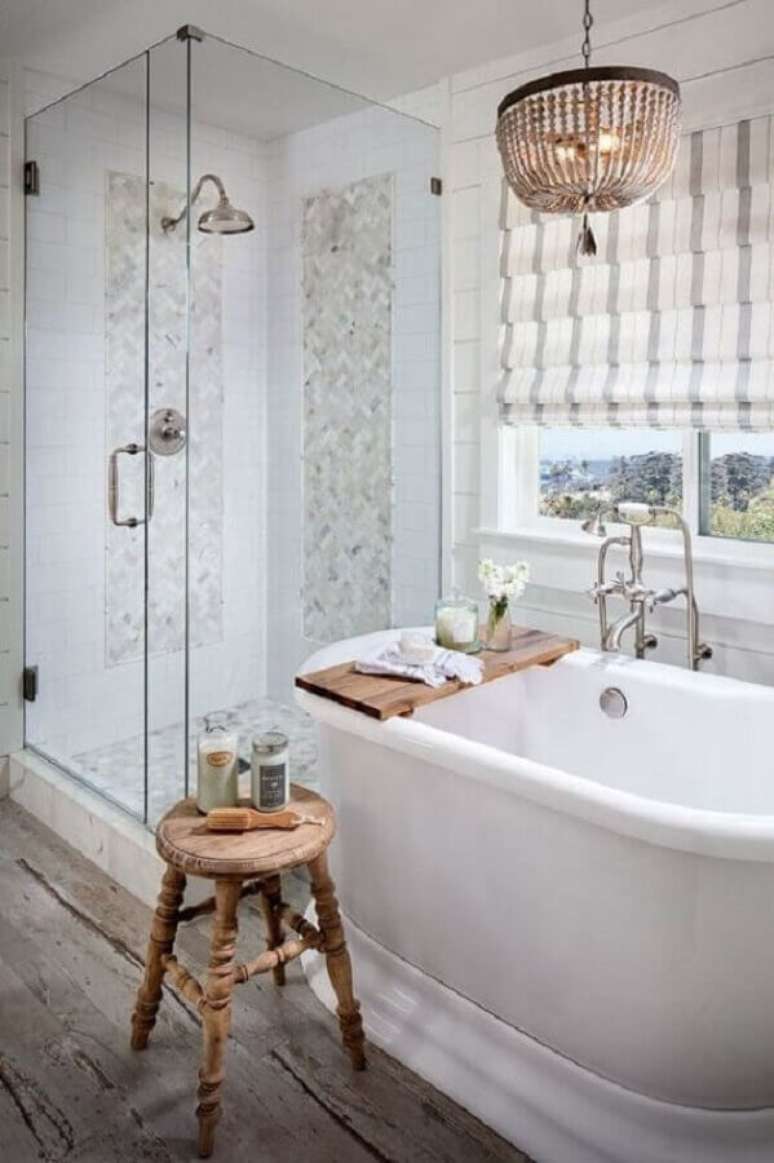Na foto abaixo você pode se inspirar com uma decoração sofisticada que usa um lustre pendente para banheiro, porém é um lustre elegante com cristais e um acabamento que garante esse toque mais requintado ao banheiro pequeno.