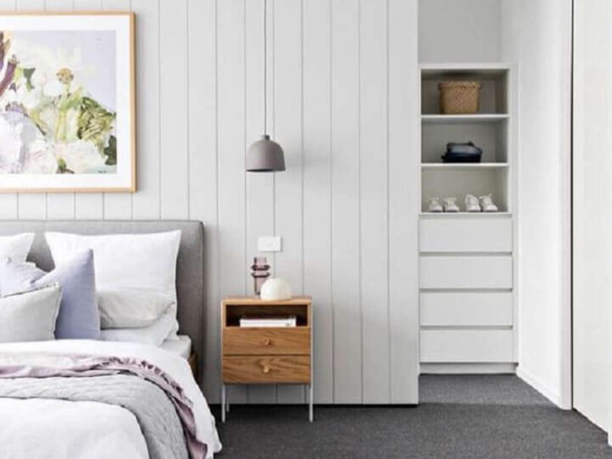 Nesses casos a melhor escolha é investir em uma mesa de cabeceira pequena ou mesmo uma mesa de cabeceira suspensa para trazer leveza à decoração. Ou ainda há a possibilidade de usar uma única mesa de cabeceira alta caso o quarto seja muito pequeno.