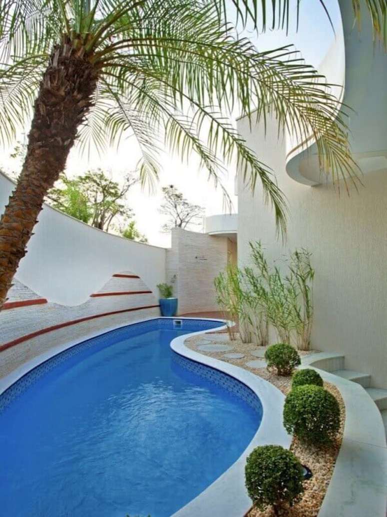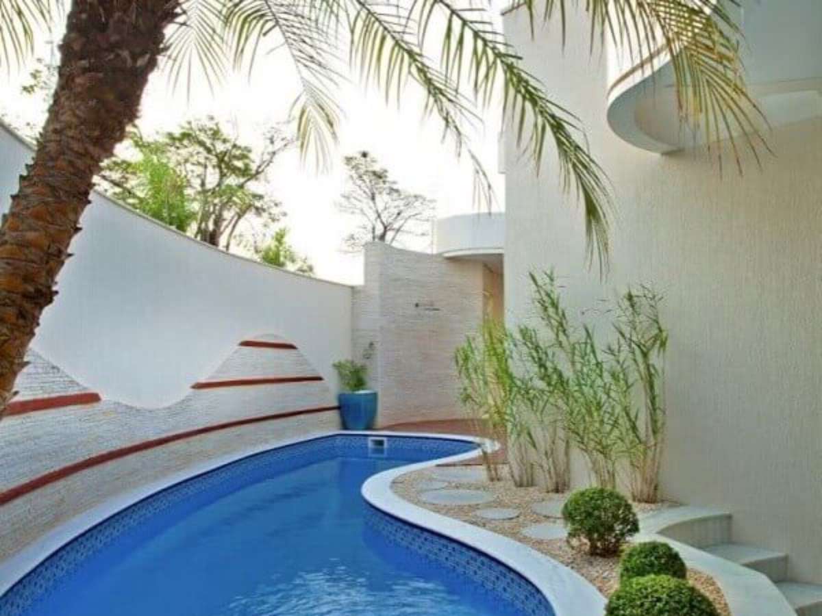 Por outro lado, as piscinas de fibra podem ser mais baratas do que as de vinil, principalmente se você decidir fazer uma piscina suspensa, que dispensa a escavação do solo. No projeto abaixo, a piscina recebeu inclusive um acabamento lateral com jardim.