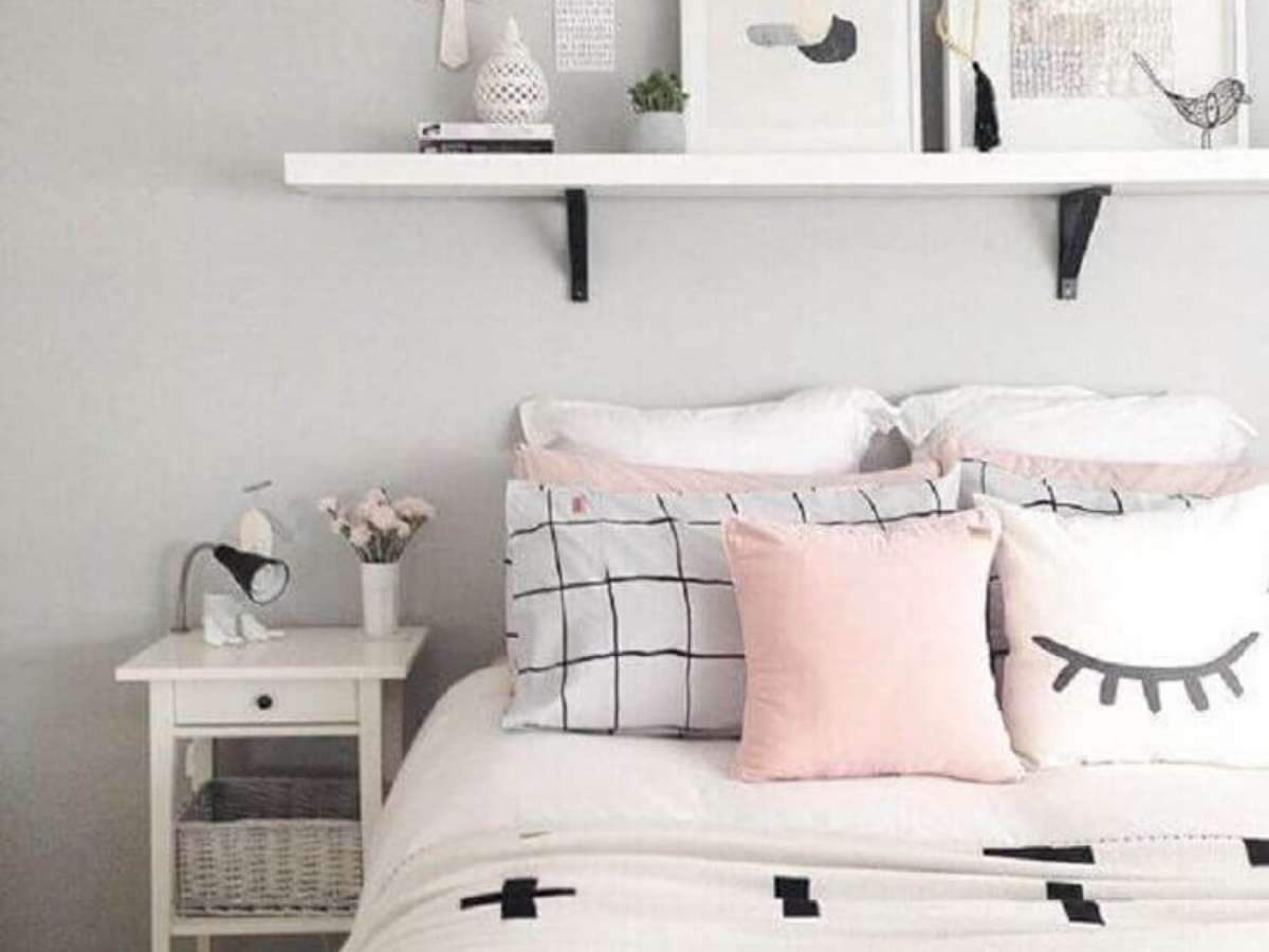 Não deixe de decorar as paredes no quarto de solteiro feminino, e o mais legal é que isso pode ser feito de diversas formas. O mais comum é investir no papel de parede para personalizar o ambiente conforme o estilo e personalidade da dona do quarto, porém se você quer otimizar espaço em um quarto de solteiro feminino simples e pequeno e ganhar um superfície que ajude na organização você também pode usar nichos e prateleiras nas paredes, pois esse itens podem ajudar a guardar livros, discos, objetos de decoração entre outros.