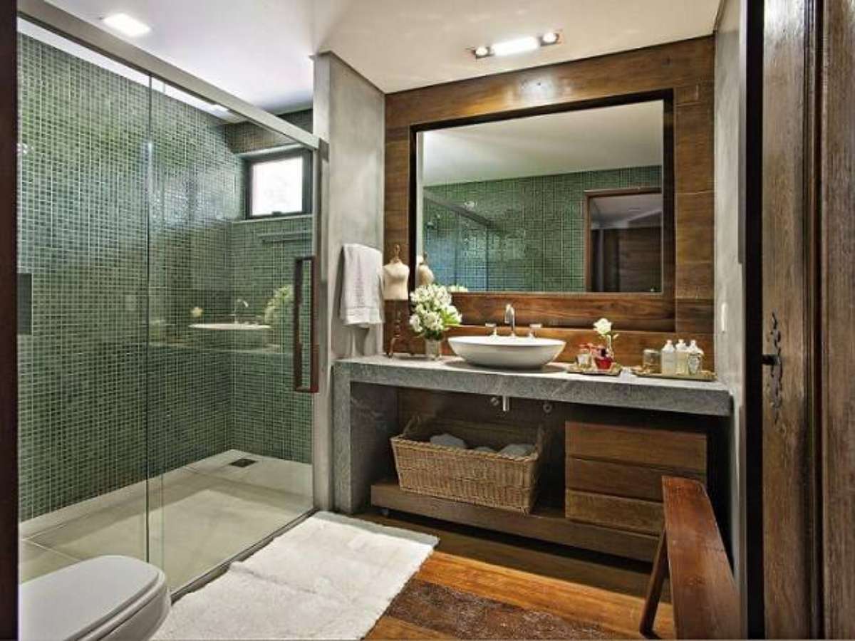 1. No banheiro, o revestimento de parede de madeira é atual e dá uma característica mais natural ao ambiente. Projeto por Gislene Lopes