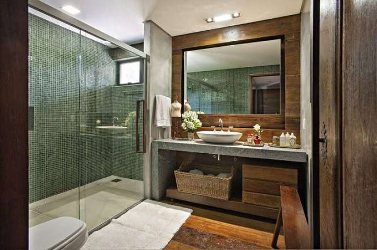 23. Apenas uma parede revestida no banheiro já dá um toque diferente ao ambiente. Projeto por Maria Helena Torres