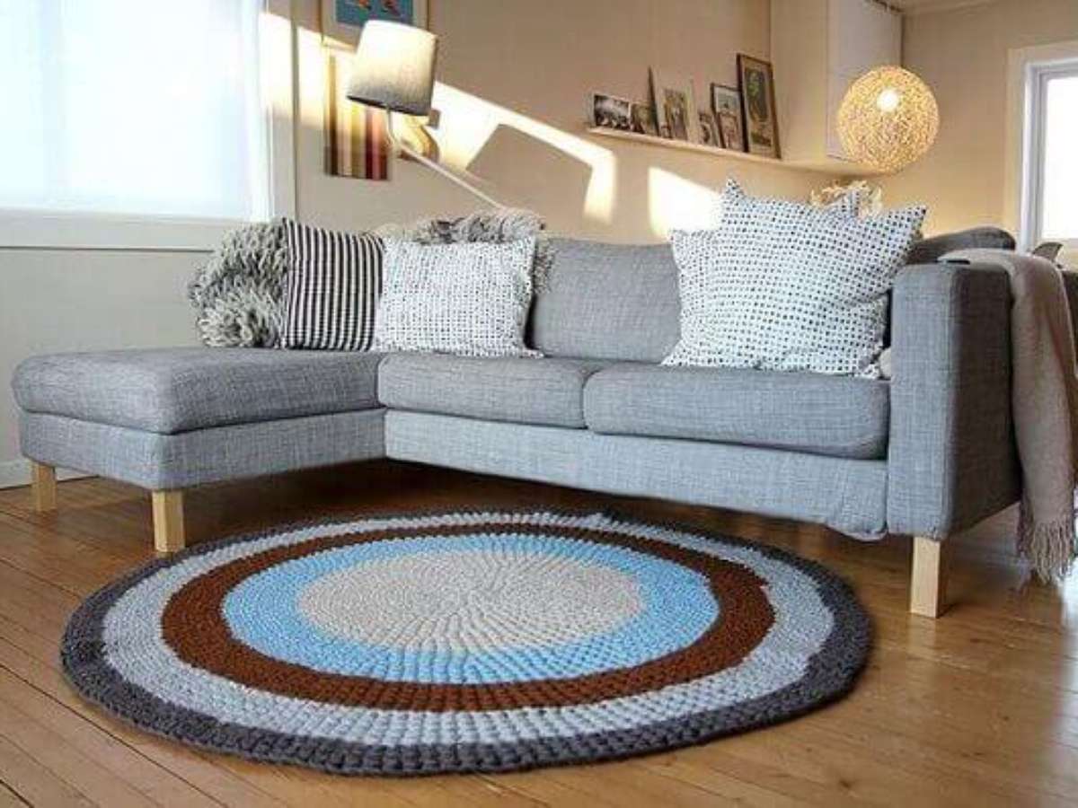 1- O tapete de crochê redondo em várias cores tem anel cinza combinando com a mesma cor do sofá. Fonte: 321Achei