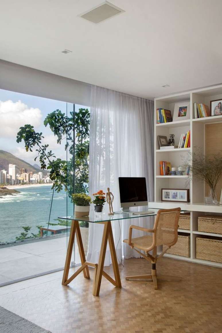 Geralmente a mesa de escritório pequena é feita de madeira, porém, existem modelos mais modernas, feitos de ferro ou com tampo de vidro. Também são opções lindas!