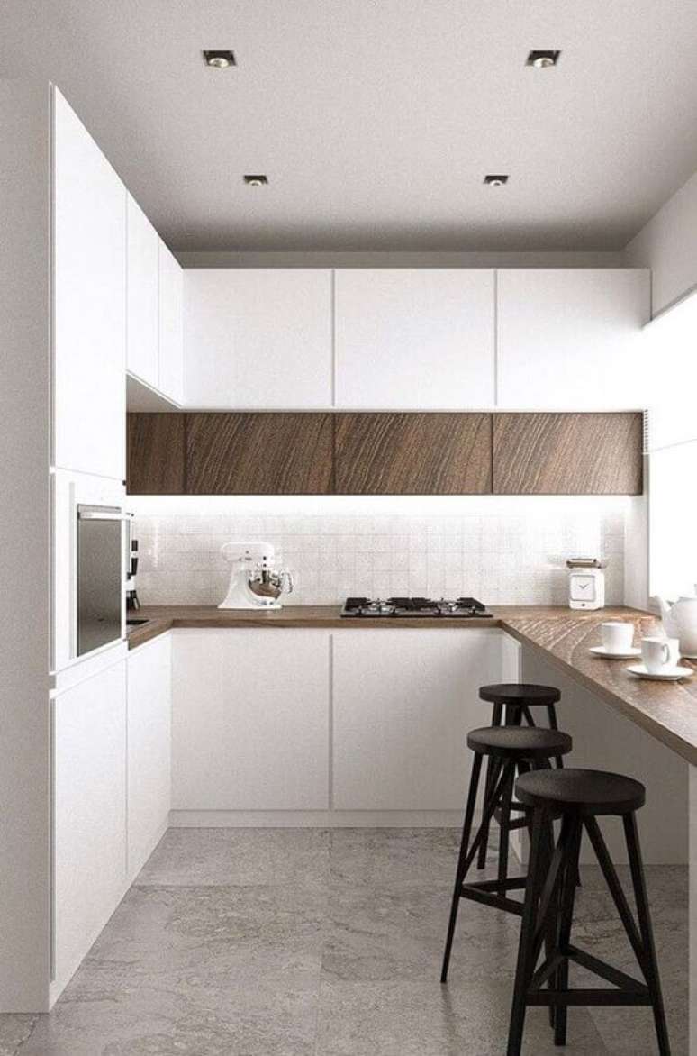 Para uma cozinha pequena, você pode comprar o armário de cozinha canto 2 peças: a de chão e a área - que ajudam a ganhar mais espaço. Outra ideia para ajudar a ganhar ainda mais espaço com o armário de cozinha é colocar uma bancada ou ilha com gavetas e até mesmo armários para guardar o que estiver fora de lugar.