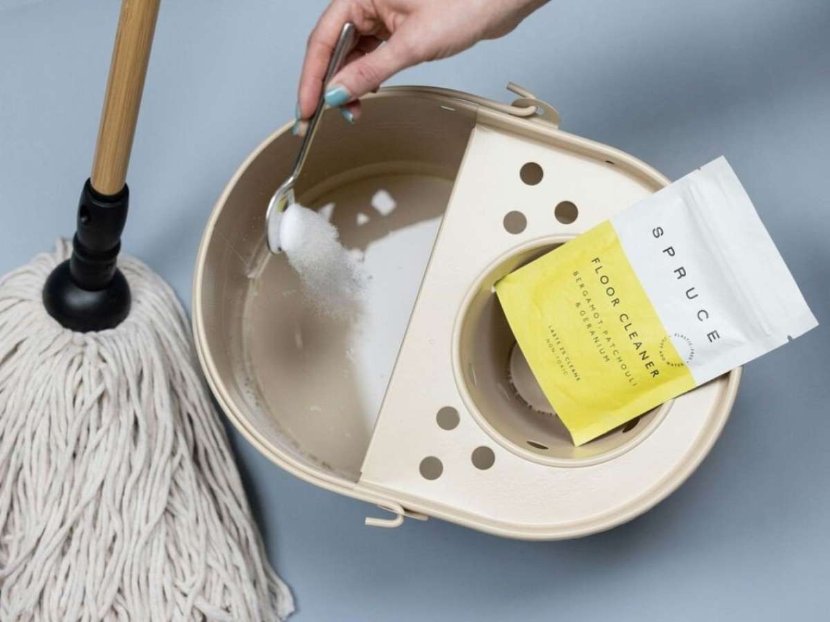 O processo é muito simples: você precisa apenas de um balde limpo, água fervente e um tablete para lava-louças (sim, aquele mesmo que você usa na máquina). Primeiro, separe o esfregão do cabo e coloque-o dentro do balde.