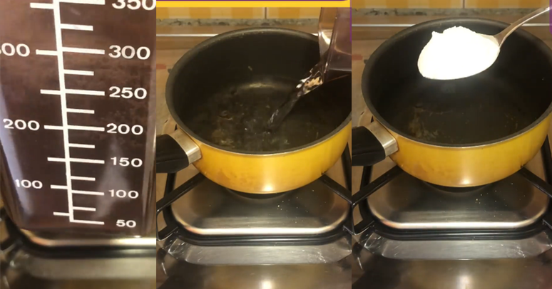 A primeira coisa que você precisa fazer é dissolver o amido de milho com o vinagre em uma panela, antes mesmo de acender o fogo.
