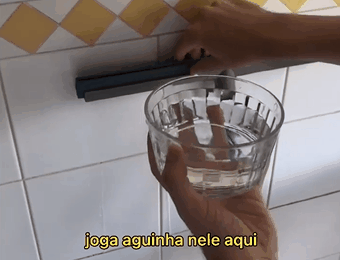 O primeiro passo é umedecer a borracha do rodo com um pouco de água para que a sujeira do chão grude facilmente nele. Você pode molhar com um borrifador, na pia ou passar com a mão, como na imagem abaixo.