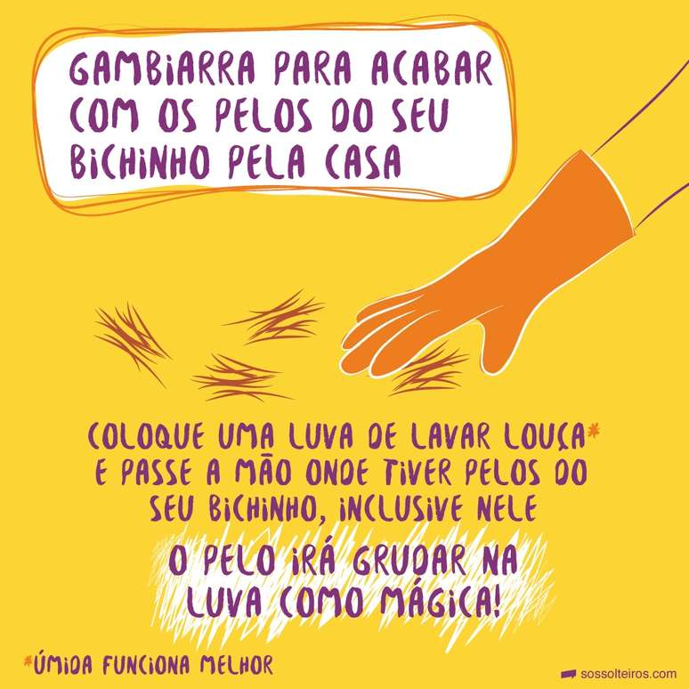 Por fim, com a borracha do rodo umedecida, passe-o por toda a casa, ou nos locais de maior concentração de pelos e poeira. Feito isso, os pelos devem ficar grudados na borracha, daí basta retirá-los com a mão a luva, um paninho ou papel toalha.