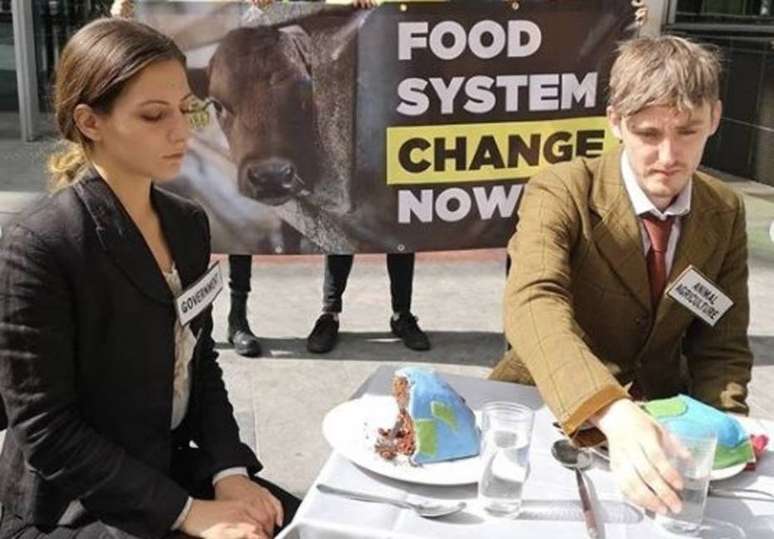 Ativistas de diversas ONGs protestaram no Reino Unido para pedir que o governo transite para um sistema alimentar vegetal. Segurando cartazes com bois, porcos e outros animais e simulando um jantar só com vegetais, os manifestantes querem a mudança com urgência.