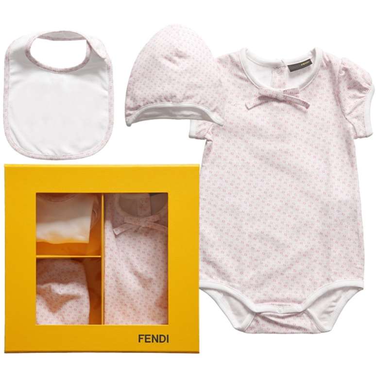 Kit de enxoval da Fendi O bebê real será definitivamente uma criança estilosa se Kate e William decidirem usar estas peças assinadas pela marca Fendi. O presente veio da loja Bel Bambini e o valor do conjunto é de US$ 265, algo em torno de R$ 590