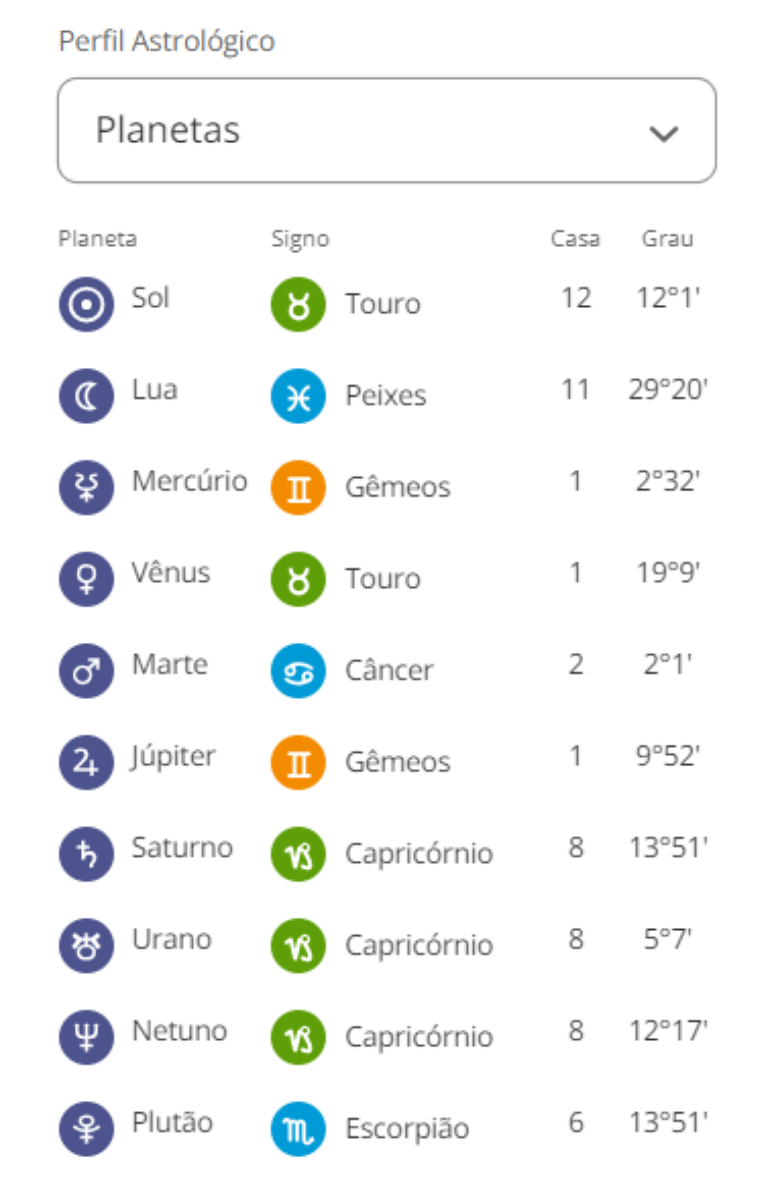 A imagem abaixo mostra um exemplo. Perceba que a pessoa com o Mapa do exemplo tem Sol em Touro e Saturno em Capricórnio.