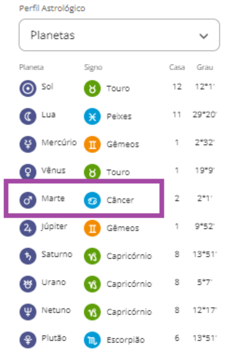 - Então, procure por Marte e veja o signo que aparece ao lado. No exemplo, abaixo, veja que a pessoa tem Marte em Câncer.