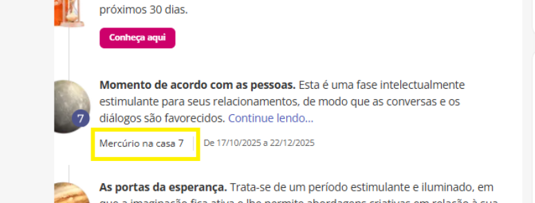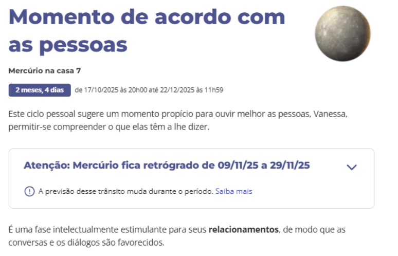 - Então, ao clicar sobre o trânsito de Mercúrio, você poderá ver a análise personalizada sobre este período na sua vida.