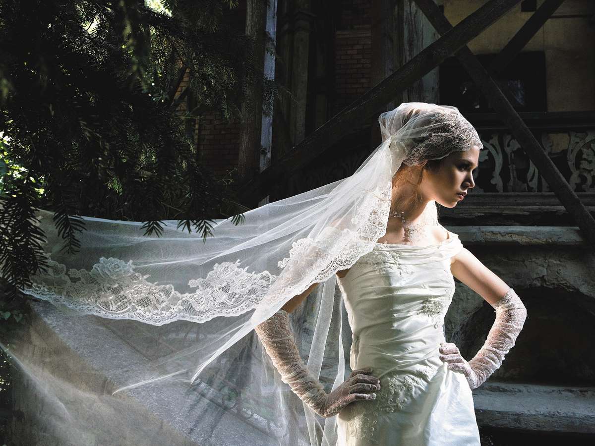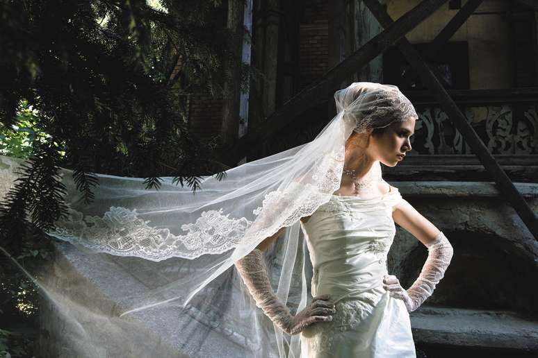 Mantilha: este modelo é feito totalmente em renda ou apenas com o acabamento nesse material. O ideal é usá-lo com vestidos mais clássicos, lisos e que não tenham tantos detalhes, para proporcionar um equilíbrio visual. Se o vestido também possuir renda, os detalhes de ambos têm que estar em harmonia