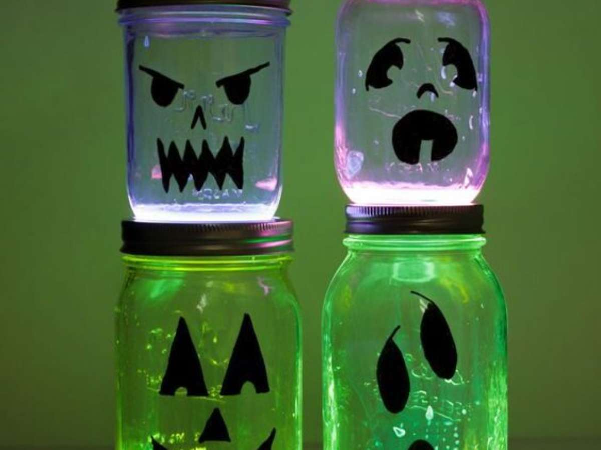 - Adicione teias de aranha falsas ao redor das tampas dos frascos para um toque extra