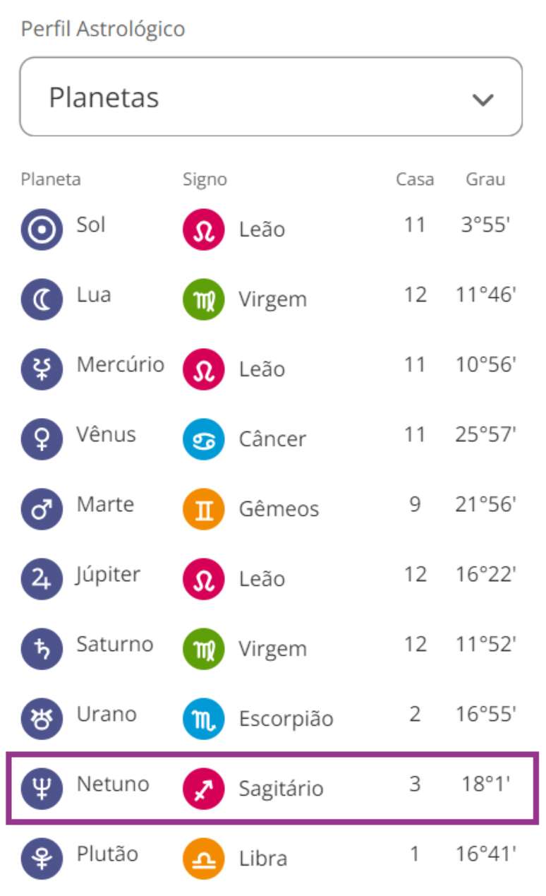 - Confira em qual signo está Netuno no seu Mapa. Por exemplo, a imagem abaixo revela uma pessoa com Netuno em Sagitário.