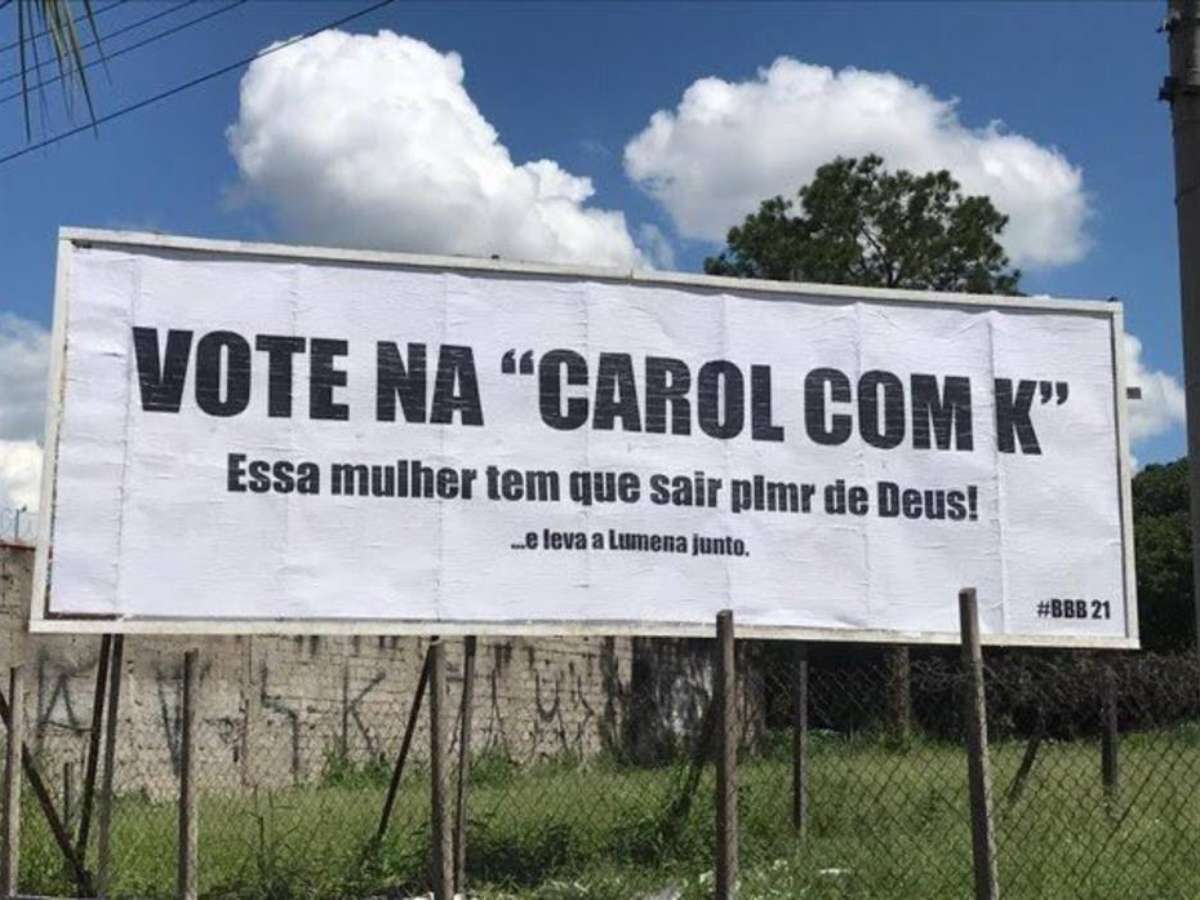 "Eu me mudei na cidade nova aqui e tinha um outdoor para comprar e eu comprei", afirmou nos stories do Instagram. O painel tem a mensagem: "Vote na 'Carol com K'. Essa mulher tem que sair plmr de Deus! Eleva a Lumena junto". "Sinto que fiz um bem para a sanidade do nosso povo", escreveu o youtuber em outro post.