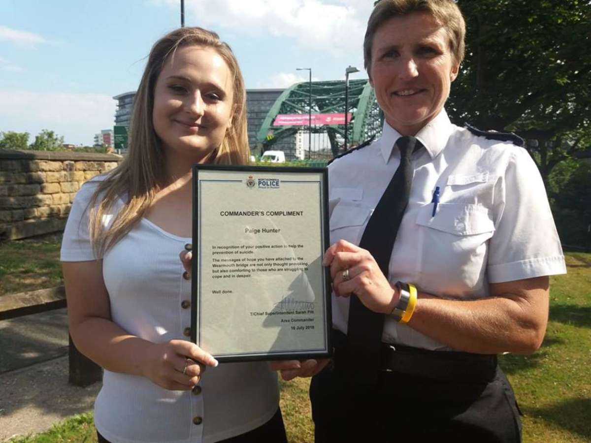Paige recebeu um certificado da polícia por sua atitude. "Ela demonstrou uma compreensão incrível sobre pessoas vulneráveis que precisam de ajuda. Esse é um modo inovador de alcançar as pessoas que estão em depressão", disse a superintendente-chefe da polícia local, Sarah Pitt, na entrega do prêmio.
