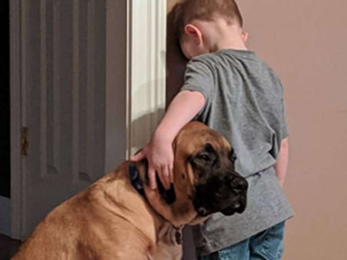 O menino ficou virado sozinho para a parede, num "cantinho da disciplina", para pensar sobre suas atitudes, mas não demorou muito para ganhar a companhia de seu cachorro Dash, da raça mastim inglês - conhecida por ser amigável e gostar de proteger seus tutores.