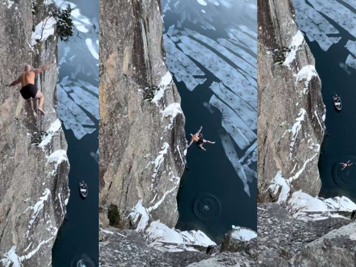 Nas imagens divulgadas por Ken Stornes, ele salta de plataforma de madeira e caí na água sem nenhum aparelho de segurança