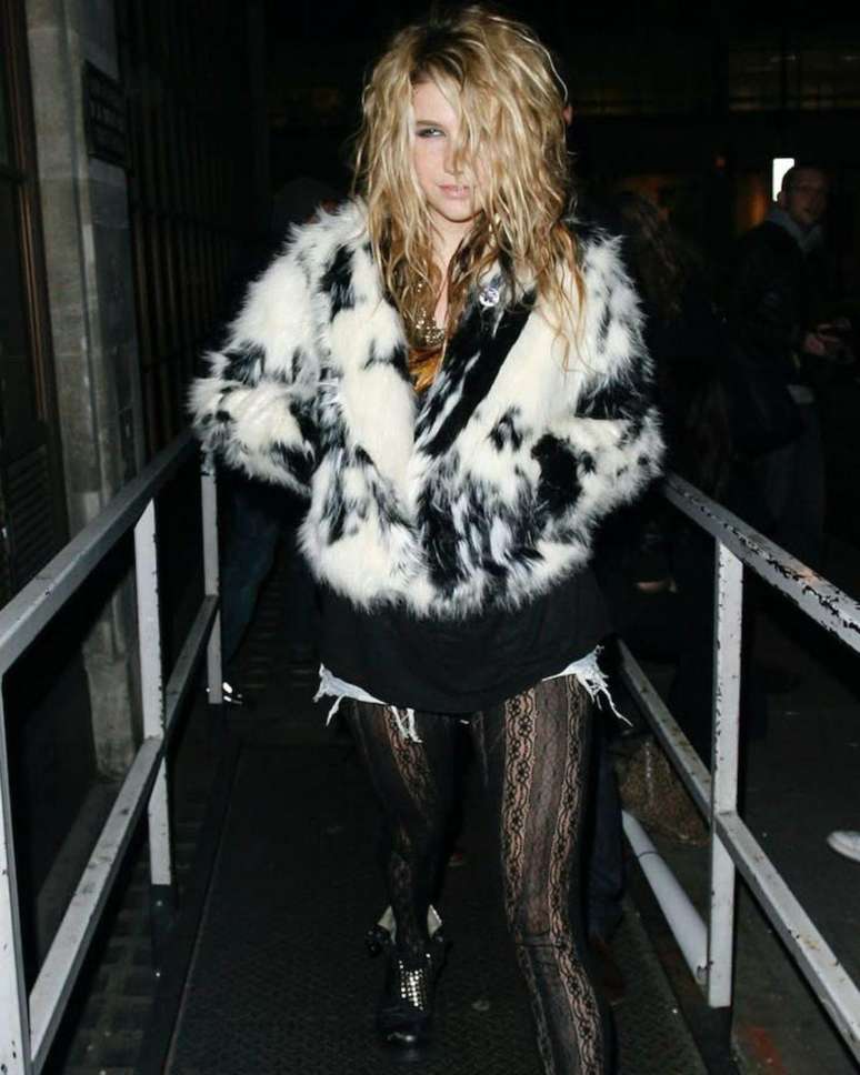 O visual é despojado e urbano. Use meia-calça desfiada com camisetas de banda e muitos paetês. O contraste entre o luxo e o "podrinho" é essencial.