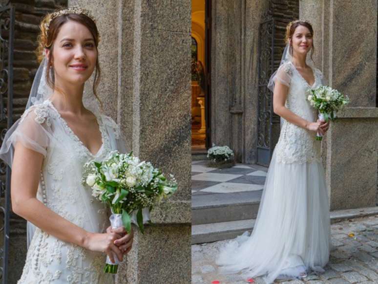 A vilã Carolina (Bianca Bin), de Guerra dos Sexos, foi desmascarada no dia do seu casamento e não conseguiu chegar ao altar. O modelito que escolheu para a cerimônia que não se concretizou era tomara que caia, com rendas francesas aplicadas e faixa com laço na cintura