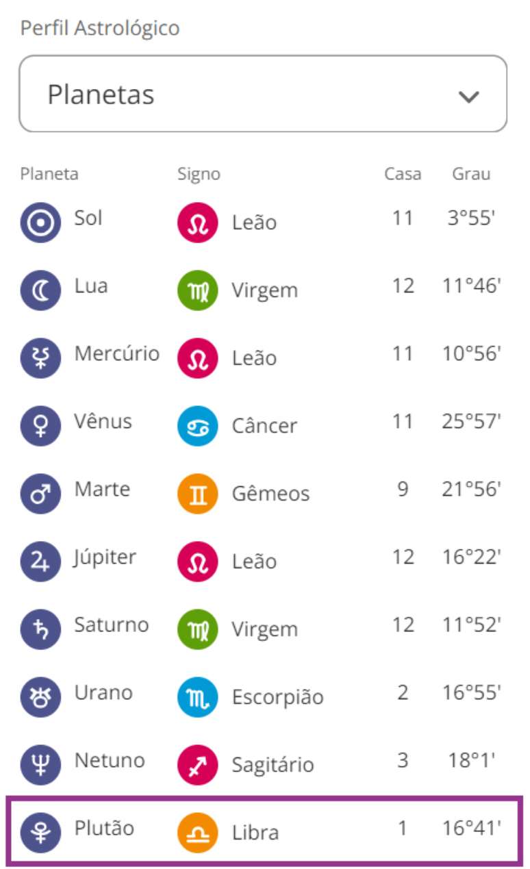 - Abaixo da mandala do seu Mapa, veja a lista de planetas e procure por Plutão.