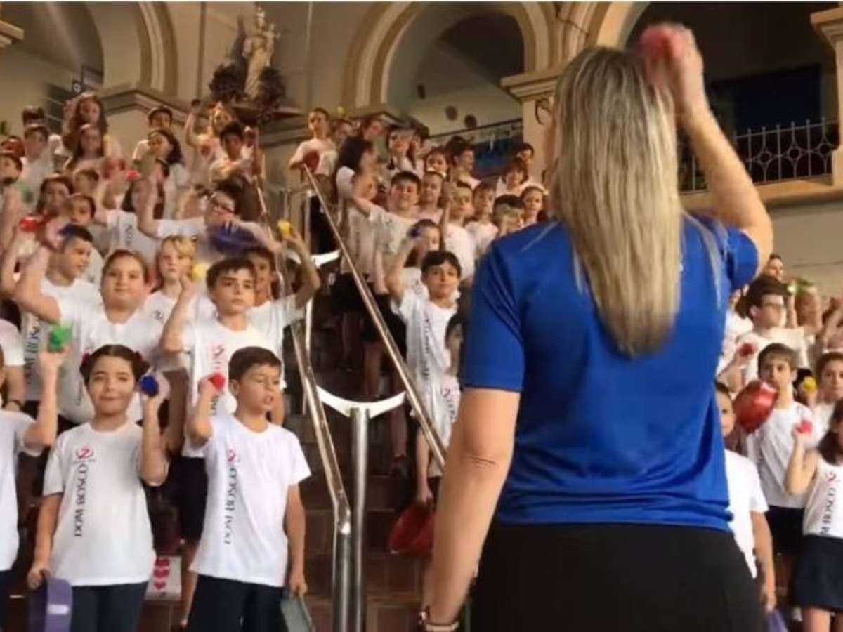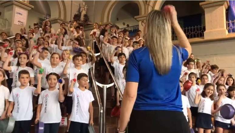 No vídeo, a professora de música Vanessa Zambão, de azul, guia as crianças na apresentação. Ela foi responsável por organizar o andamento da música e criar os arranjos de instrumentos e corpo. Assista:
