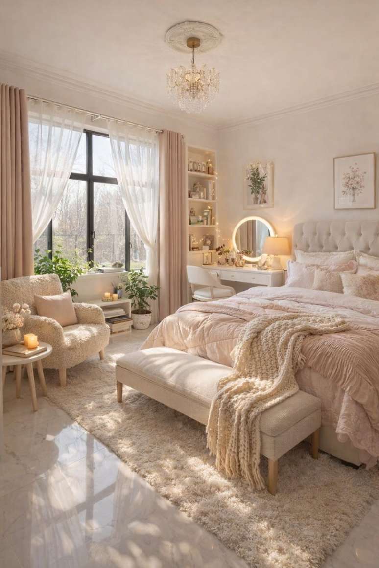 Uma cama bem arrumada com lençóis de algodão é a prioridade máxima. Prateleiras para organizar livros e cristais são muito bem-vindas aqui!