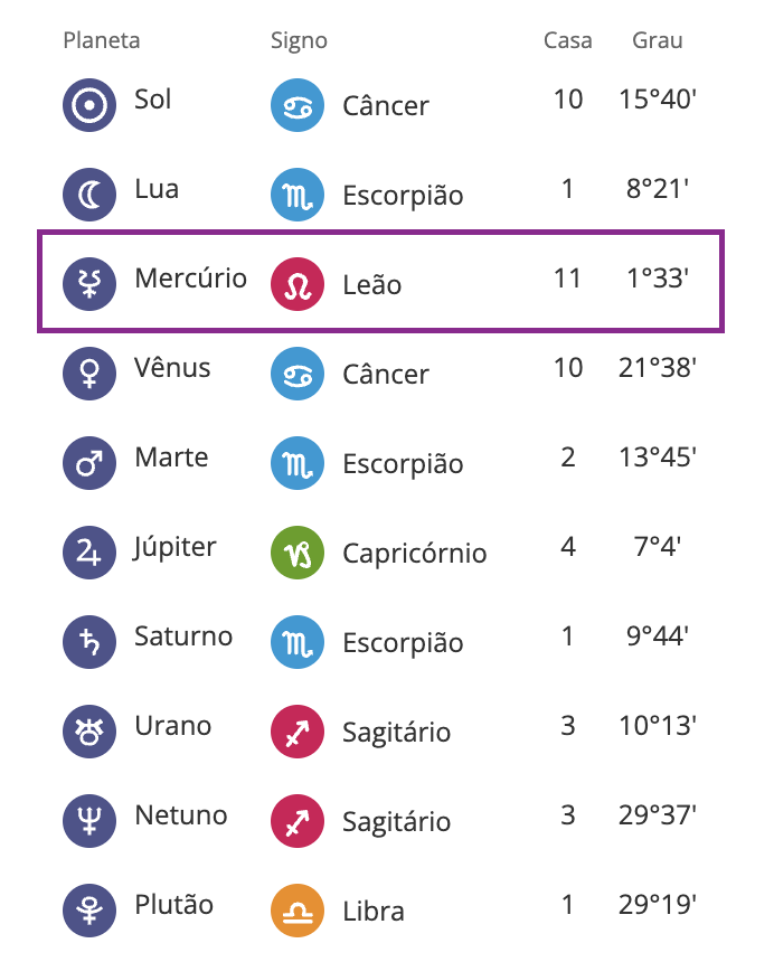 - Por exemplo, a pessoa com o Mapa da imagem abaixo tem Mercúrio em Leão na Casa 11.