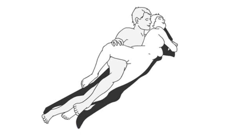 As pernas ficam na mesma posição da sonolenta - ela com uma perna em cima do quadril dele e ele com uma no meio das suas coxas. A diferença é que a mulher fica totalmente de costas para o homem, com seu corpo encaixando no dele! Outro jeito gostoso de transar de conchinha, né?