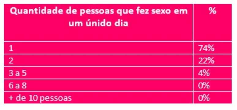 A pesquisa também reuniu dados que mostram quantas relaçõs sexuais os brasileiros já tiveram em um único dia.