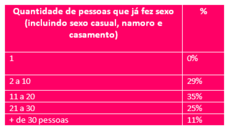 Cerca de 1.542 voluntários foram entrevistados pra saber com quantas pessoas tiveram relações sexuais ao longo da vida, e a maioria entre 31 e 35 anos de idade, se relacionou com até 20 pessoas.