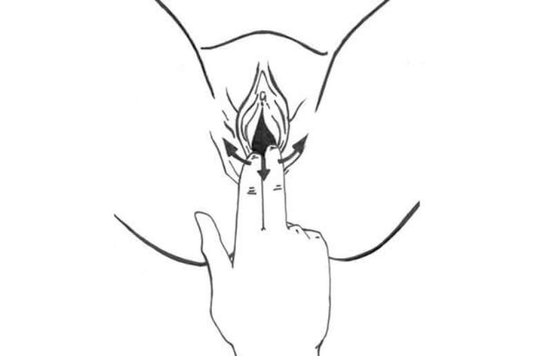 - Basta se posicionar confortavelmente e depois introduzir dois dedos no "óstio vaginal" (veja ilustração acima) e realizar uma leve pressão para baixo, como é demonstrado pelas setas na ilustração.