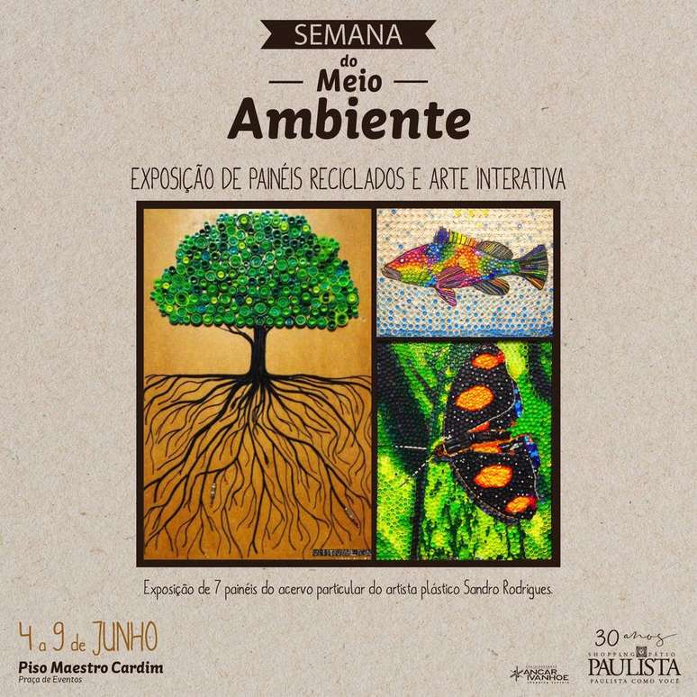 Exposição de quadros e esculturas feitas com materiais recicláveis ocorre no Shopping Pátio Paulista até este domingo, 9, das 10h às 22h, e a entrada é franca. A mostra comemora o Dia Mundial do Meio Ambiente.