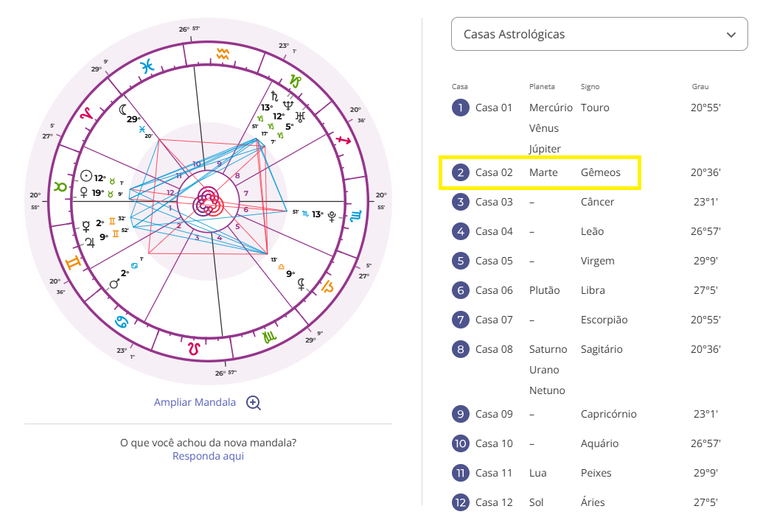 - Então, confira o signo que está na sua Casa 2. Abaixo, por exemplo, a imagem mostra uma pessoa com Gêmeos na Casa 2.