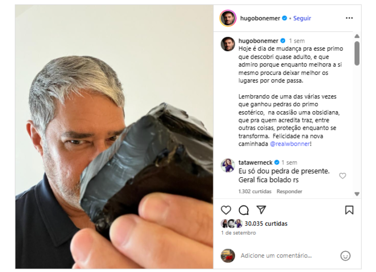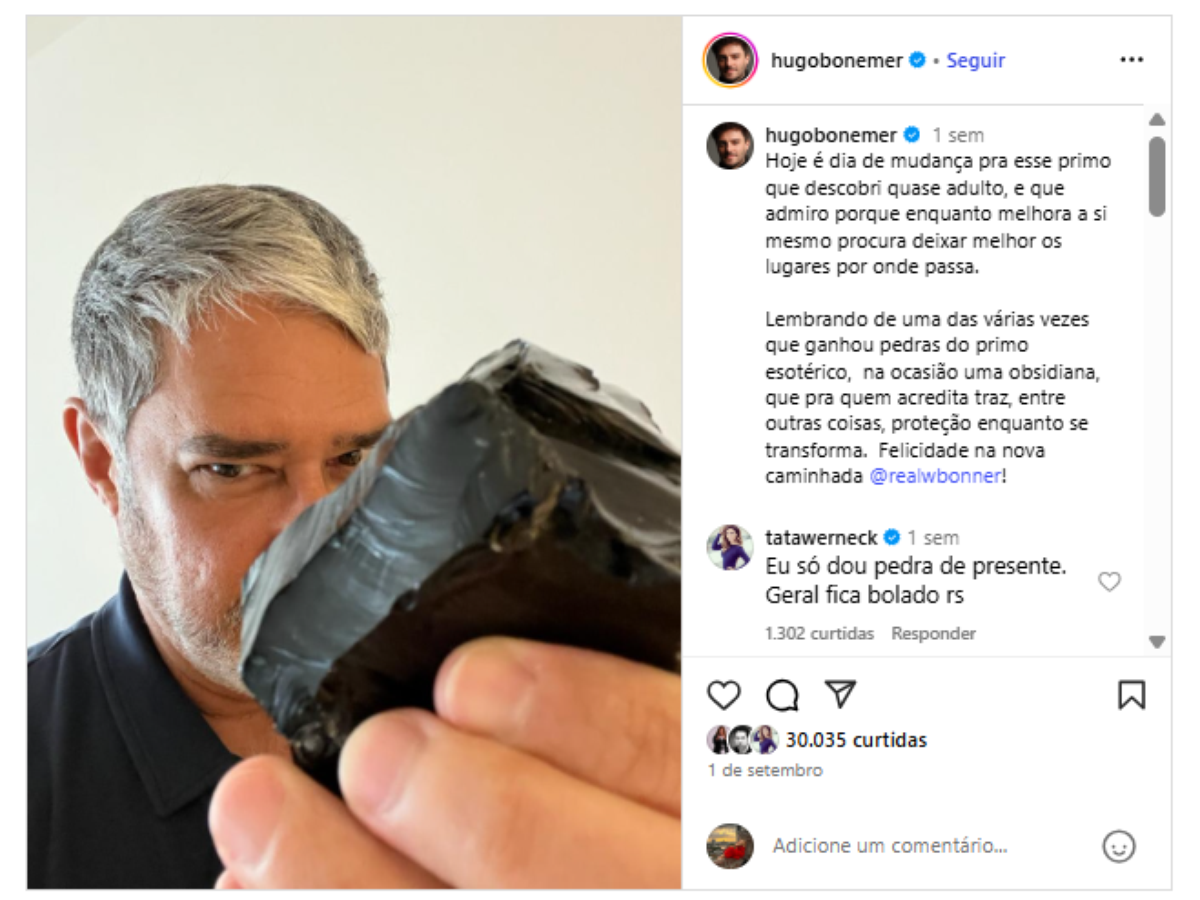 Na mensagem compartilhada sobre a saída de William Bonner do Jornal Nacional, Hugo Bonèmer relembrou que já havia presenteado seu primo outras vezes com pedras de significado especial.