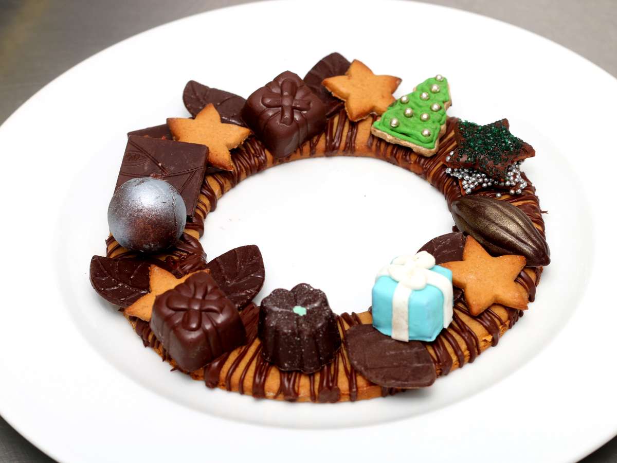 Preencha uma frigideira antiaderente com uma camada fina da massa, e deixe dourar em ambos os lados. Depois que o crepe ficar pronto, recheie com chocolate derretido ou creme de avelã. Se quiser, adicione frutas vermelhas, como morangos e framboesas, além de elementos decorativos natalinos.