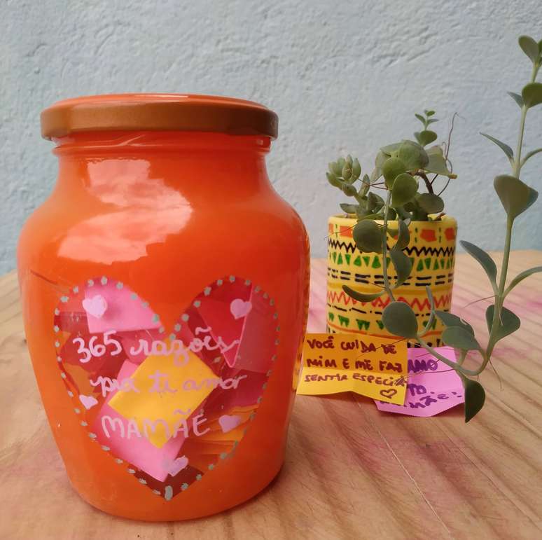 Se você é fã das lembrancinhas autorais - ou se o dinheiro este ano está mais curto -, já separa um pote bem bonito e papéis coloridos. Nós batizamos o nosso de ' 365 razões para te amar, mamãe!'- onde a ideia é colocar motivos que a fazem ser tão maravilhosa-, mas você pode escrever o que quiser, desde que, claro, tenha muito amor envolvido!