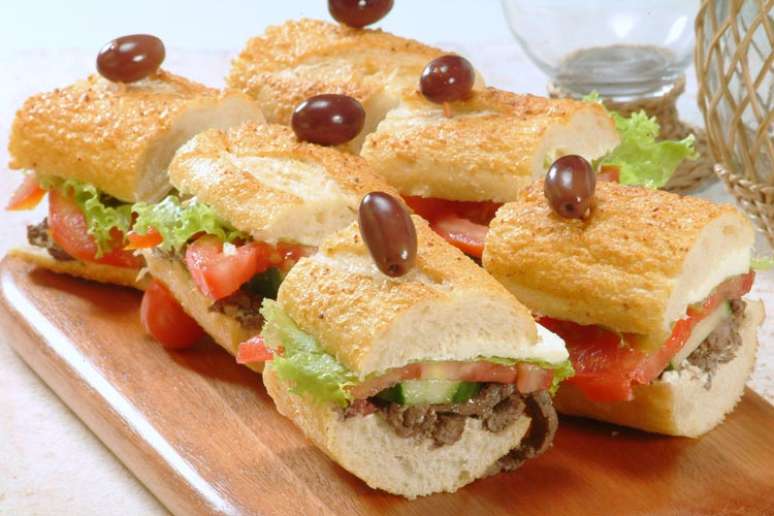 Tempere com sal e feche o lanche. Decore com azeitonas pretas, fatie e sirva.