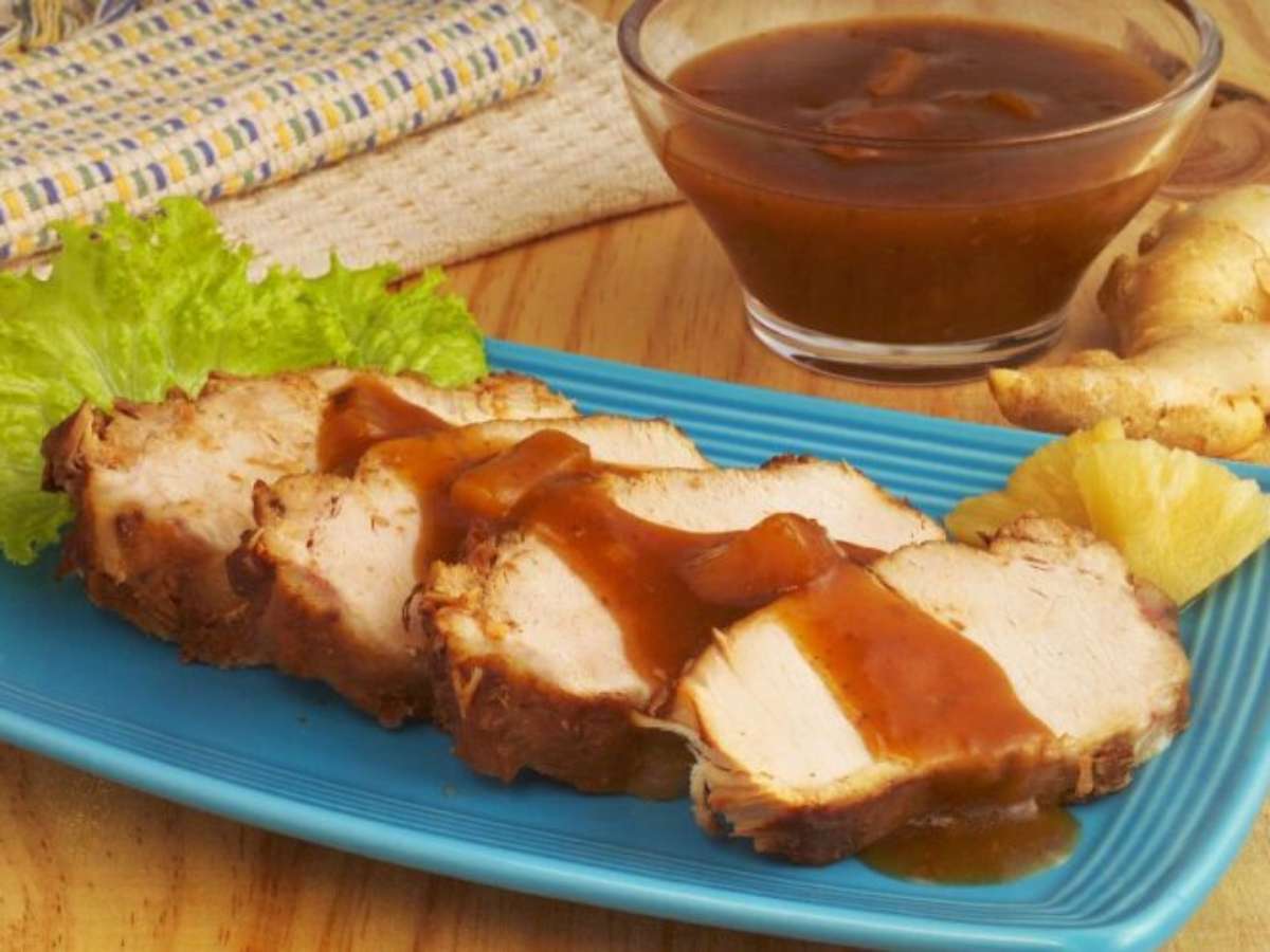 Aqueça uma panela com o óleo. Tempere o lombo com sal, pimenta e alho e doure na panela. Acrescente o gengibre, a cebola, e o mel e refogue por 5 minutos em fogo médio. Despeje o chá e cozinhe com a panela semitampada por 1 hora ou até o lombo amaciar. Acrescente o abacaxi e cozinhe por 10 minutos. Retire o lombo e deixe descansar por 10 minutos e fatie. Transfira as fatias para uma travessa. Dissolva a maisena na água e despeje na panela ligada com o molho, mexendo até engrossar. Regue as fatias com o molho ou sirva à parte na molheira. Se desejar, decore com folhas verdes e pedaços de abacaxi.