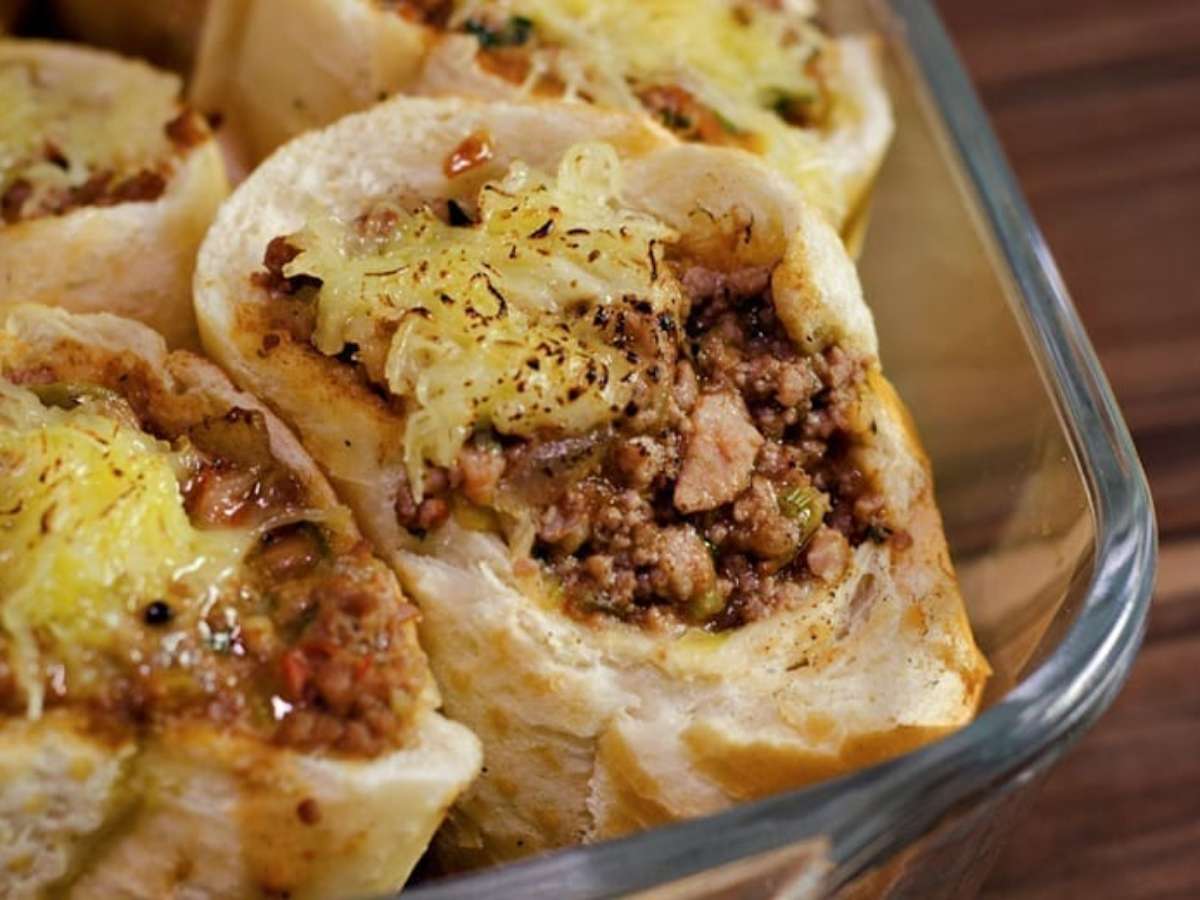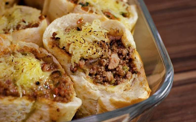 Em uma panela, aqueça o óleo, em fogo médio, e refogue a cebola e o alho por 3 minutos. Junte o tomate e refogue por 2 minutos. Adicione a carne, o caldo de carne, a azeitona e refogue por 5 minutos ou até secar. Polvilhe a farinha e mexa até engrossar levemente. Tempere com sal, pimenta e salsa picada. Deixe amornar. Divida a carne entre as metades de pães sem o miolo e coloque em uma fôrma, um ao lado do outro. Polvilhe com a mussarela e leve ao forno médio, preaquecido, por 15 minutos ou até gratinar. Retire e sirva em seguida.